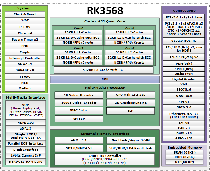 乐竞在线官网(中国)官方网站微乐竞在线官网(中国)官方网站3568 CPU为四核Cortex-A55,采用全新Arm v8.2-A架构,效能有效提升;GPU为Mali-G52 ,双核心架构,图像API支持OpenGL ES 3.2, 2.0, 1.1,Vulkan 1.1。内置乐竞在线官网(中国)官方网站微自研第三代独立NPU,可提供1T算力,支持Caffe/TensorFlow/TFLite/ONNX/PyTorch/Keras/Da乐竞在线官网(中国)官方网站net主流架构模型的一键转换。
