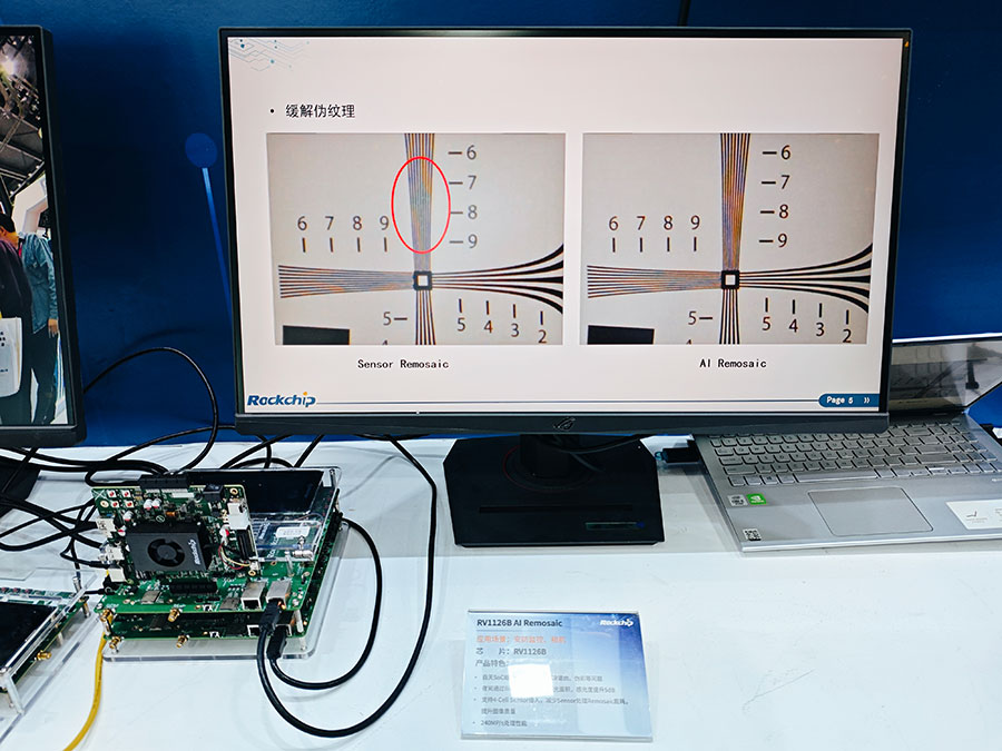 • 星光夜视AI-ISP:RV1126B集成专用 AI-ISP 硬件,运行 AI-ISP时无需占用通用的3T NPU 资源,较传统 NPU 方案更节省带宽与功耗。结合 AI Remosaic 技术实现 "日夜双模自适应"—— 白天呈现超高清画质,夜晚在超低照度下仍保持清晰成像。