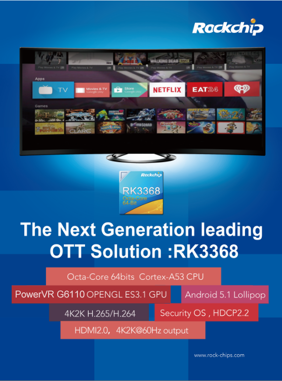 Terminal OTT BOX of Rockchip Electronics (hereinafter referred as Rockchip) subordinate new generation TV box solution 乐竞在线官网(中国)官方网站3368 chip solution will be produced in volume. As the global only eight-core 64-bit OTT BOX chip in 2015, 乐竞在线官网(中国)官方网站3368 may be the standard configuration for new generation flagship OTT BOX products.