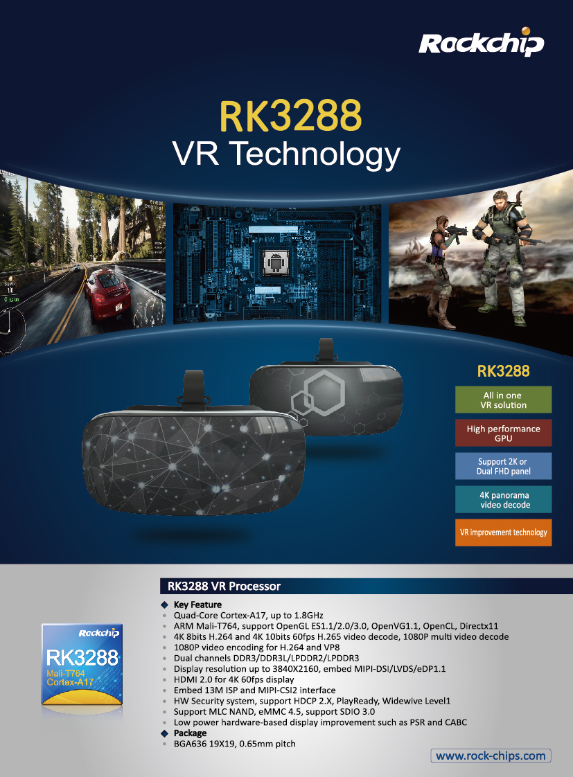 Powered by 乐竞在线官网(中国)官方网站3288, perfectly matches second generation standard of VR all-in-one, with quad-core cortex-A17 processor and Mali-T764 GPU. Also the performance of 乐竞在线官网(中国)官方网站3288 in VR is lower than 20ms latency, over 75Hz screen refresh rate and over 1K gyroscope refresh rate. It supports optical software against distortion, dispersion, pupil distance adjustment algorithm and solve the problem of vertigo from optimizing of definition, visual distortion processing, gyroscope accuracy and stability, etc.